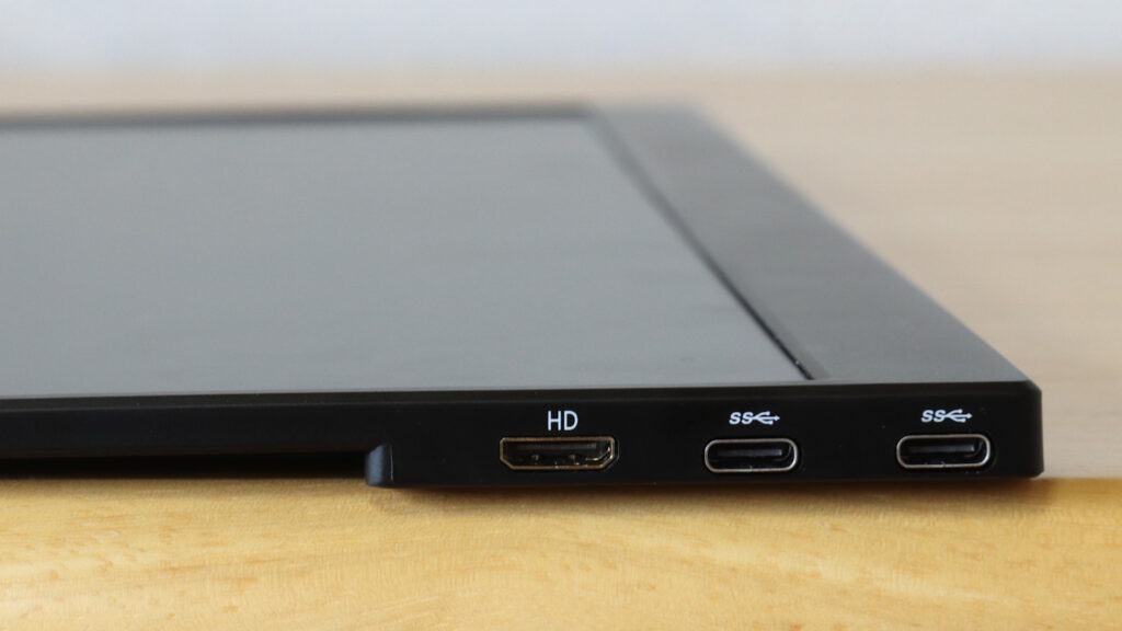 映像入力はミニHDMIとUSB Type-Cに対応しており、電源もUSB Type-Cから供給可能です。付属のケーブルやポーチがあるので、購入後すぐに外部ディスプレイとして使えます。Windows PCのサブディスプレイとしても便利ですが、バッテリーは内蔵されていないため、外部電源が必要です。